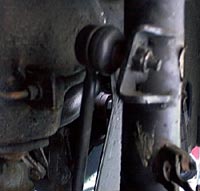 For those who want to know all the details : Those droplinks may become troublesome now and then, but they make themselves useful too: they make the bar twist about 70% more for the same body roll, adding a lot to roll stiffness. Why they make the bar twist more is easy to see if you consider how the lower arm on the XL suspension moves up and down. It acts like a lever arm, for every inch the strut (balljoint) moves up, the anti-rollbar end only moves up about 0.6". With the GTI suspension, the rollbar end follows the full strut movement through the droplinks. I will update this page later with anti-rollbar thickness measurements. They look quite similar in the pictures, suggesting that Peugeot upped the roll stiffness a LOT for the GTI models. About time, I'd say, after driving the XL 1.9 on standard suspension for a while and always wondering when it would roll over completely ;)